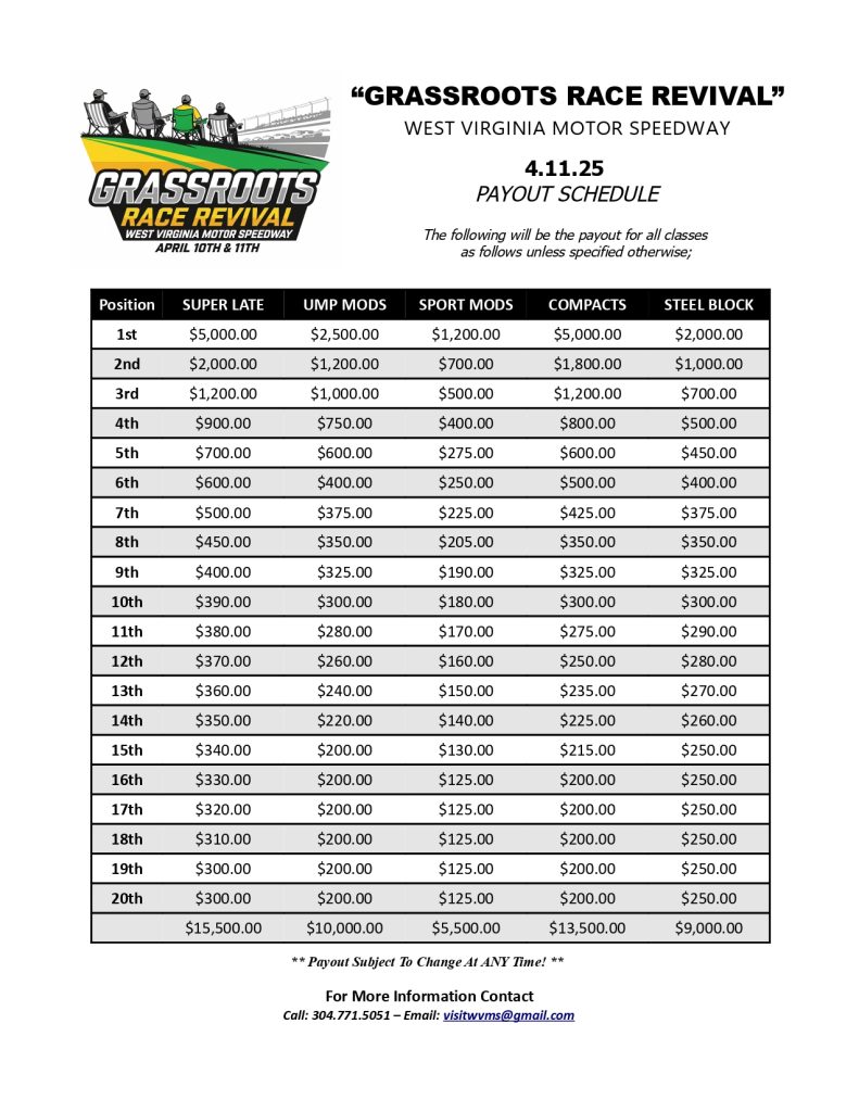 UMP Modifieds will pay $1,200 to win and $600 for second, with third at $400, fourth at $325, and fifth at $275. The purse continues strong through the field, paying $125 from 15th through 20th place. Pro Late Models will pay $1,000 to win, $500 for second, $400 for third, $300 for fourth, and $250 for fifth. Payouts remain steady all the way through the field with $100 from 17th to 20th place. Sport Mods will pay $700 to win, $300 for second, $250 for third, $200 for fourth, and $170 for fifth. From 14th on back, the class maintains a guaranteed payout of $75 for all starters through 20th position. Super Late Models headline the event with a massive $5,000 to win payout. Second place will take home $2,000, third $1,200, fourth $900, and fifth $700. The purse remains strong throughout the field, with $300 guaranteed to all positions through 20th place.